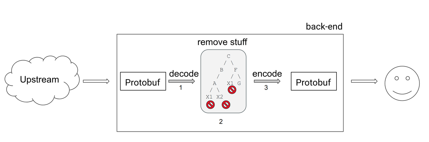 Before diving in, let’s recall a few things: 1. Protobuf is a tree-based data structure; 2. The trees we receive have no internal order to take advantage of; 3. Our algorithm searches for specific nodes and removes them from the tree; 4. We don’t know what the trees look like beforehand.